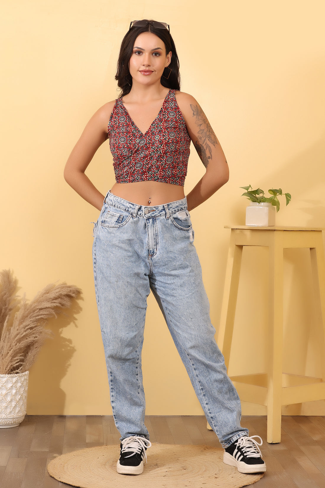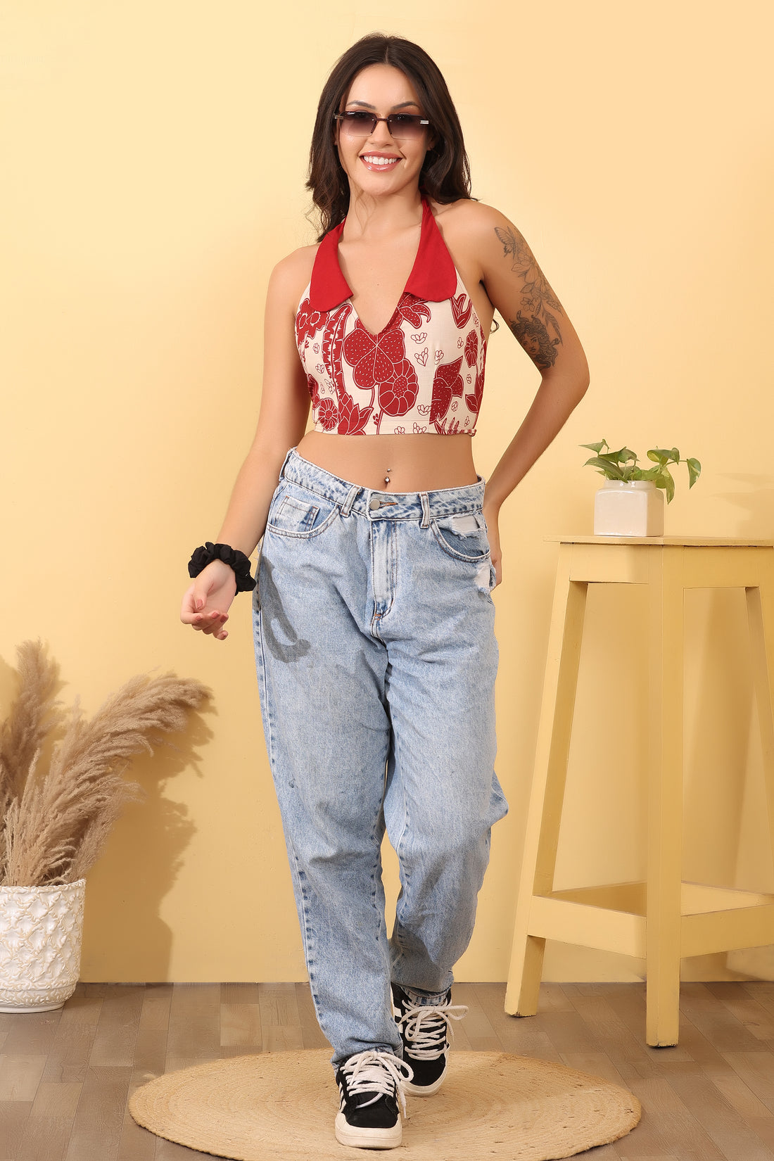 Women’s Red Printed Halter Neck Crop Top | Stylish Cotton Summer Top