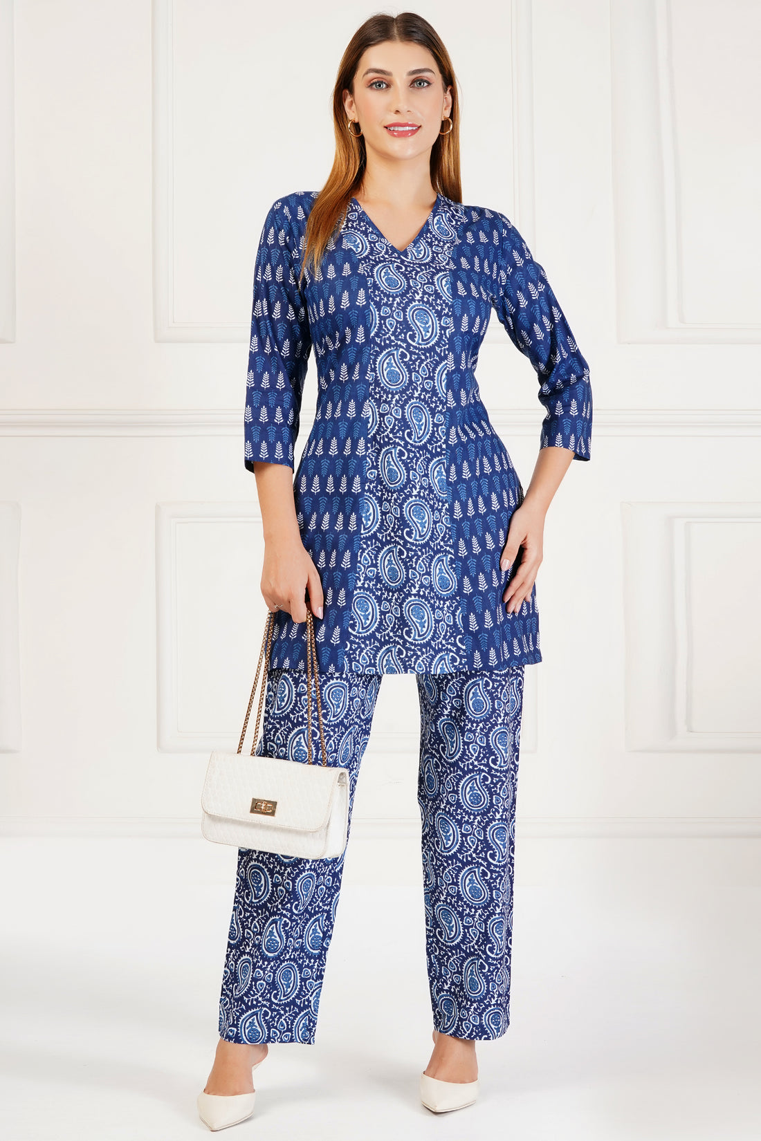Ethnoza Blue Paisley & Leaf Print Co-Ord Set – Serene Bloom Edition