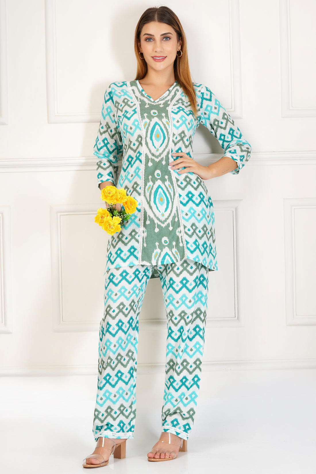 Ethnoza Aqua Green Ikat Print Co-Ord Set – Timeless Threads Edition