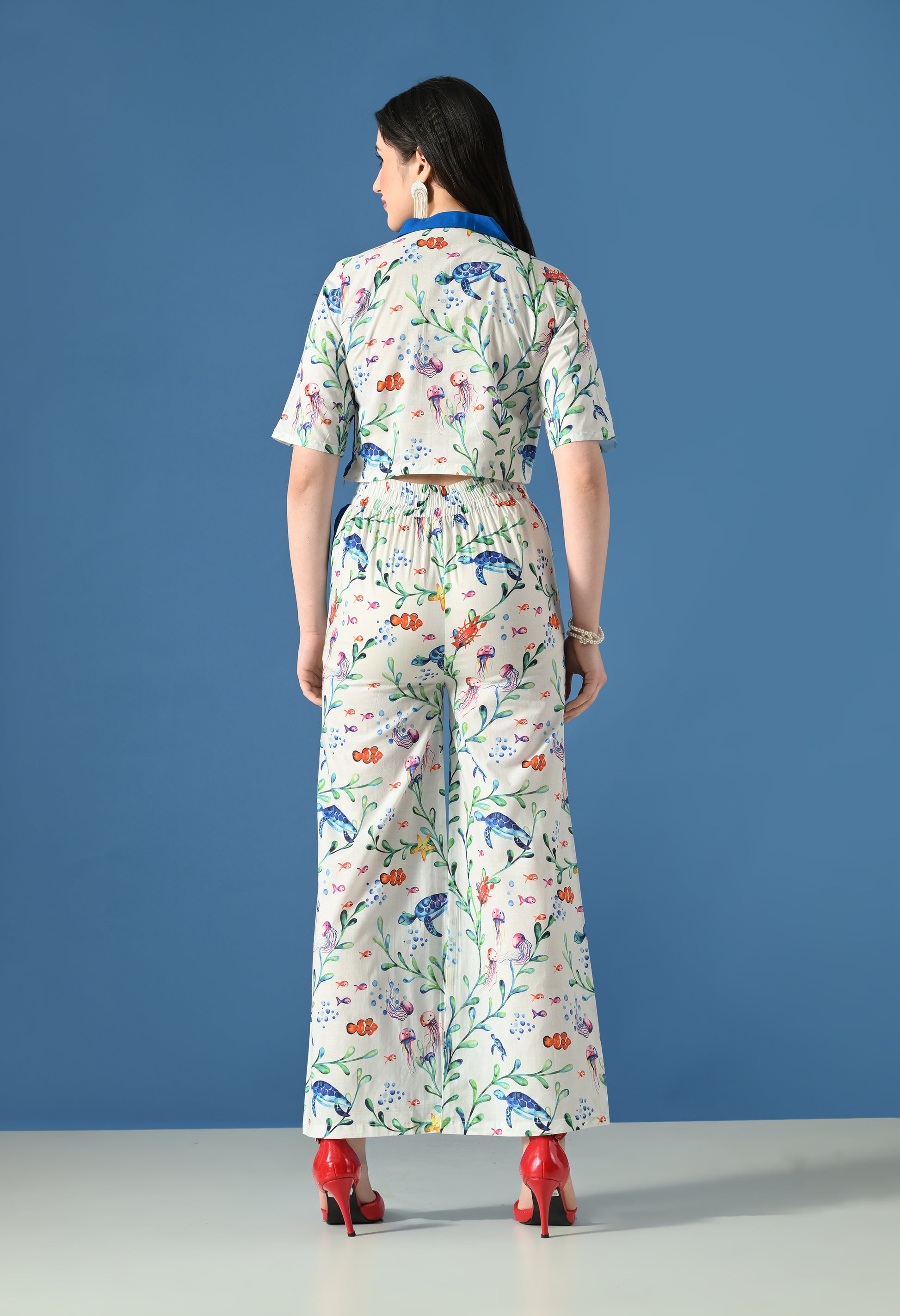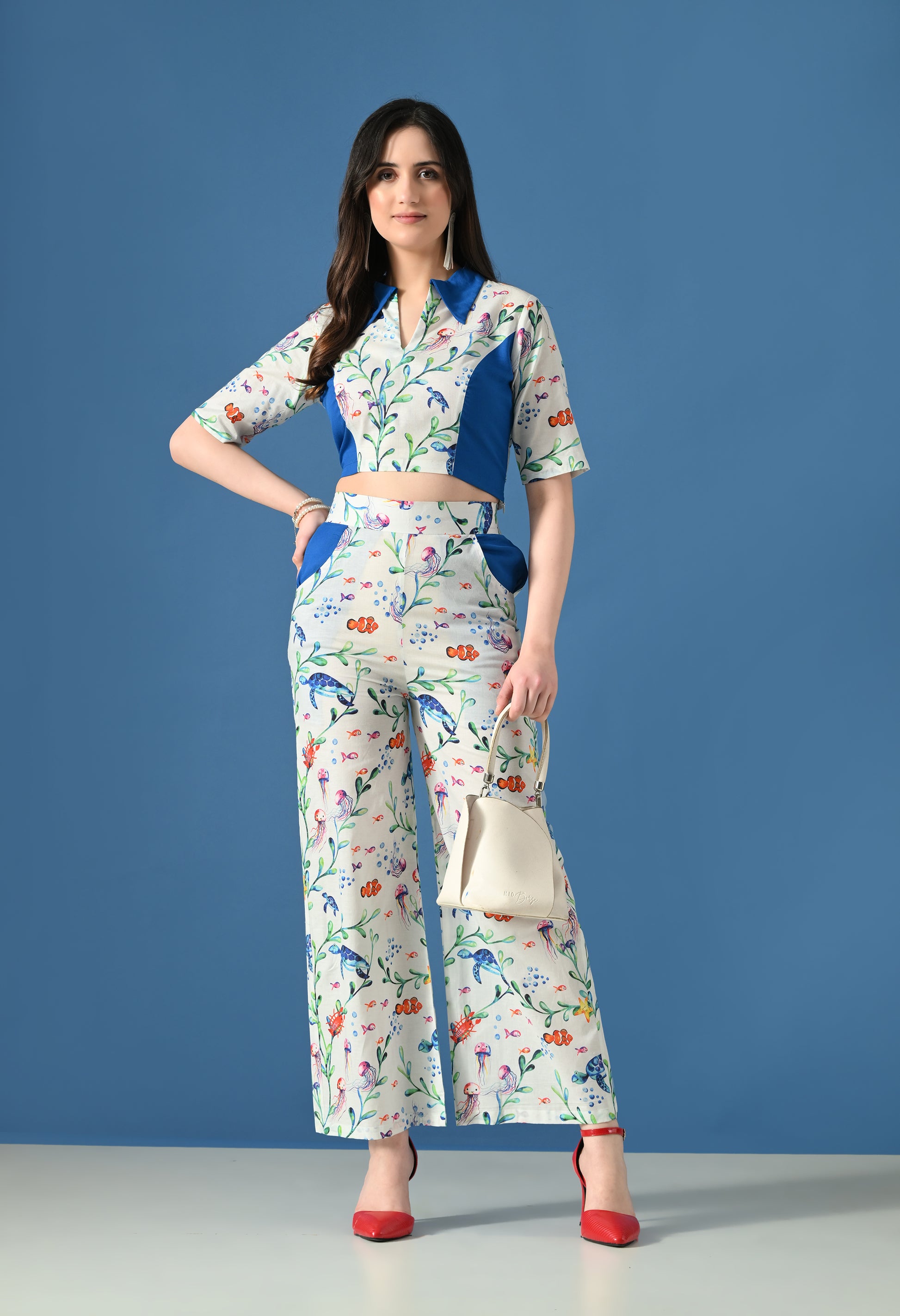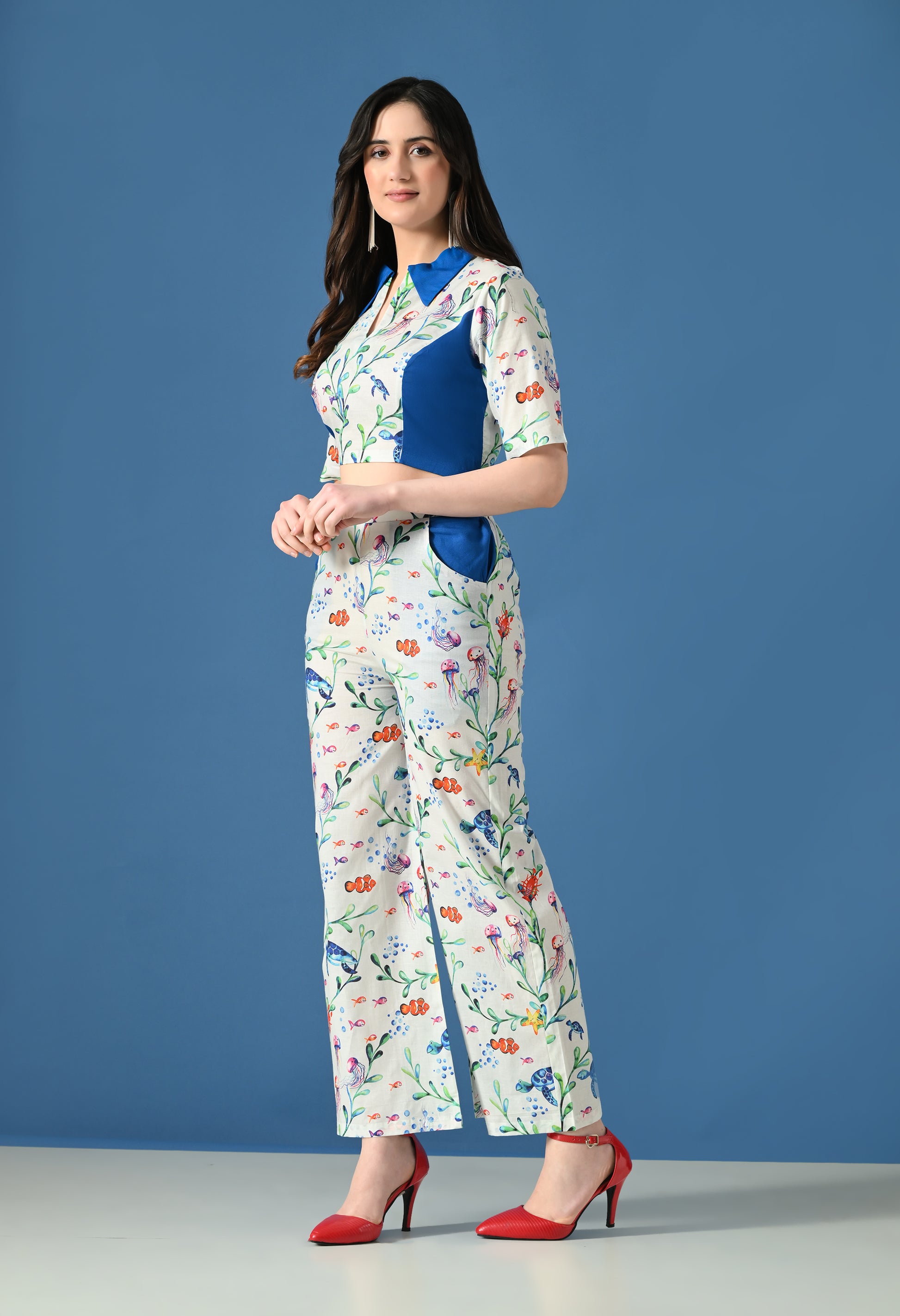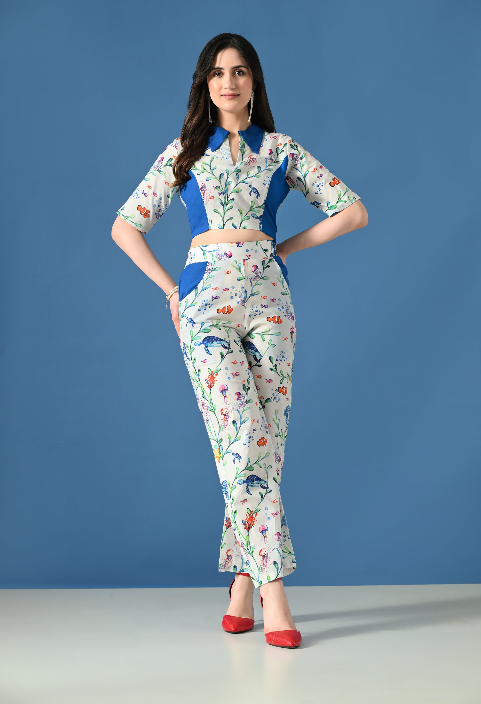 Make a bold yet elegant statement with the Blue Coral Co-Ord Set, inspired by ocean life and coral blooms. Featuring a striking marine print accented with solid blue panels, this co-ord set blends playful charm with structured sophistication.