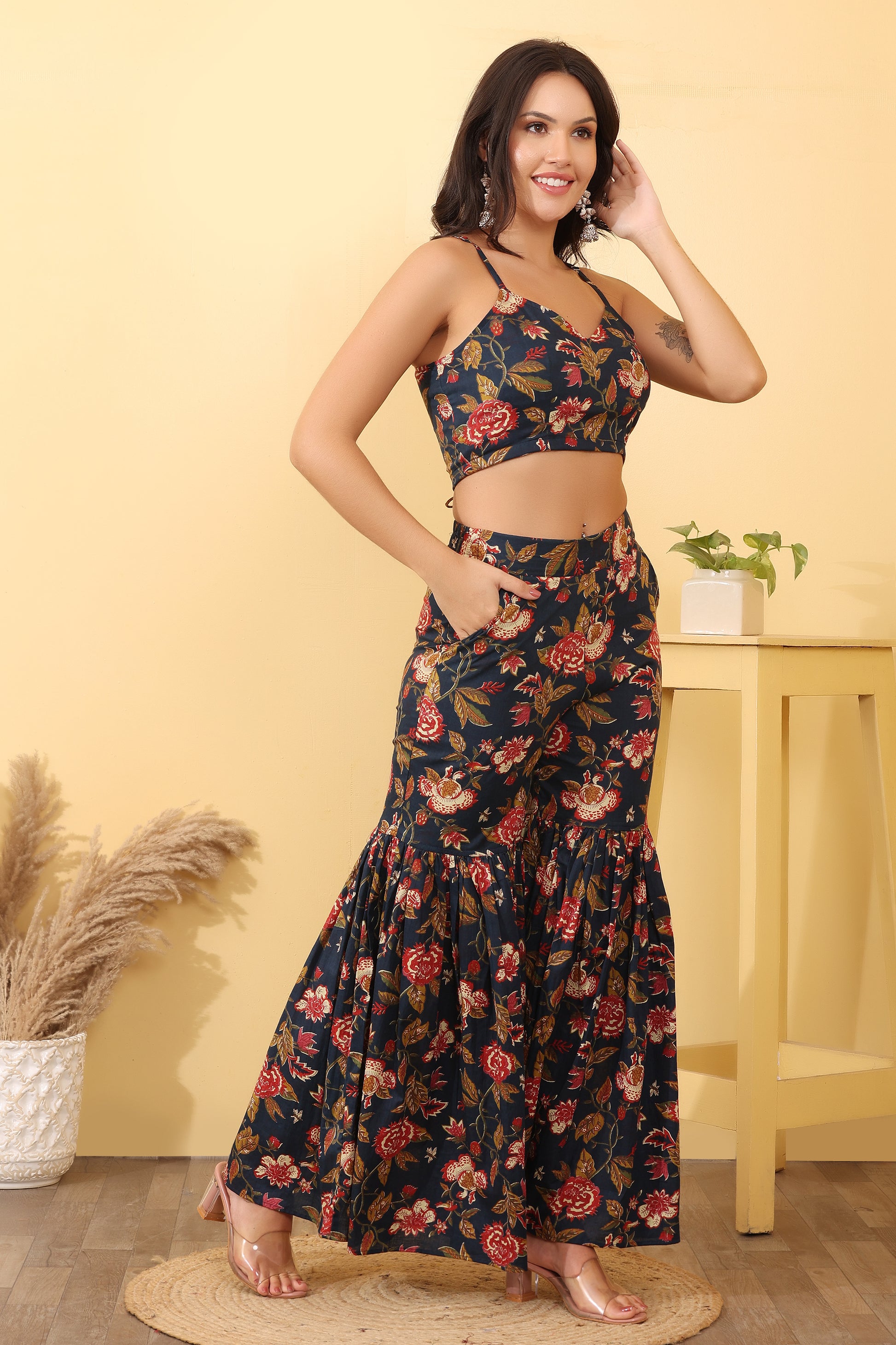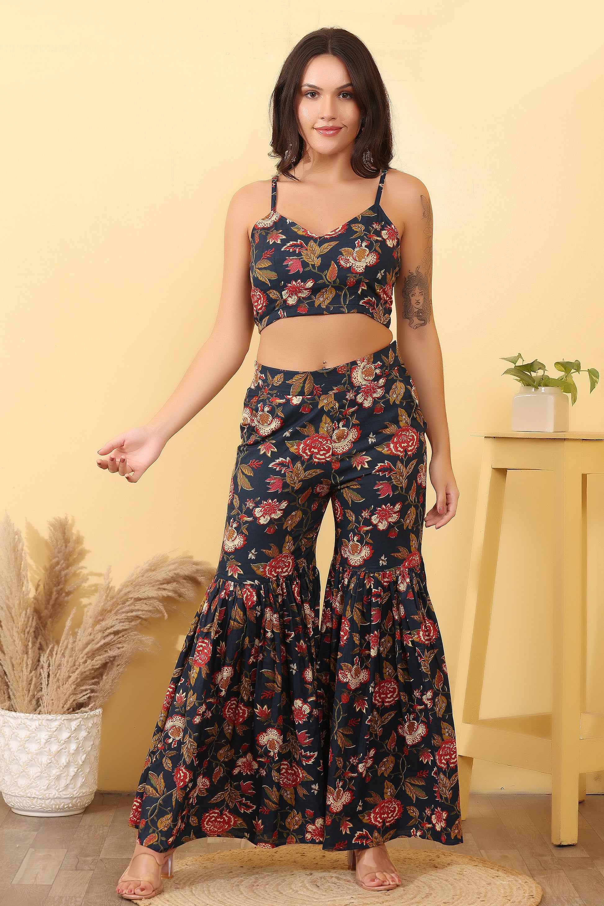 Add a touch of elegance to your wardrobe with this stylish women cotton floral printed co-ord set, designed for modern fashion lovers. This outfit features a spaghetti strap crop top paired with flared sharara style pants, giving it a fashionable and graceful look.