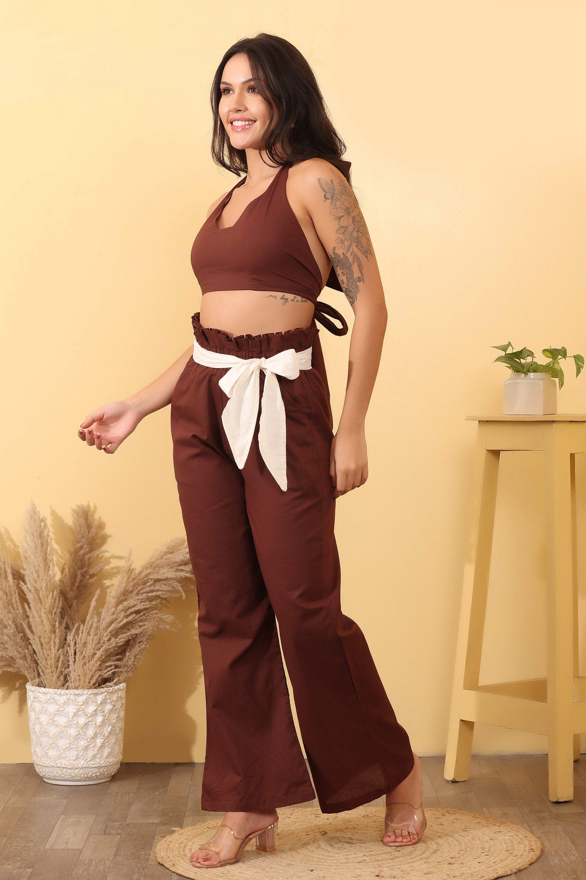 Made from premium quality cotton fabric, this co-ord set offers excellent breathability and comfort, making it perfect for warm weather and everyday wear. The elegant brown color with a contrast waist belt design adds a fashionable and sophisticated touch to the outfit.